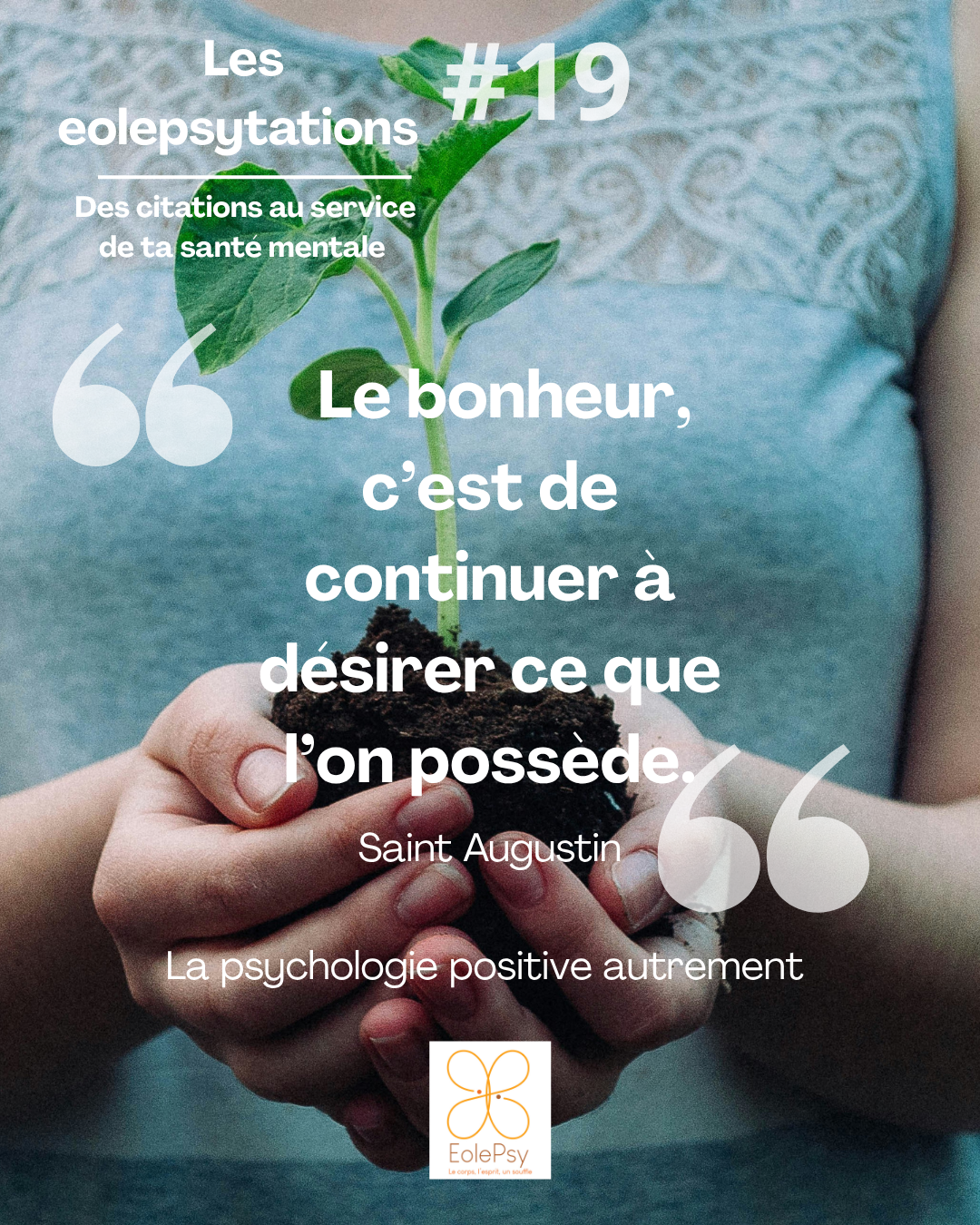 Bonjour, à toutes et à tous. 👉 Bienvenue pour cette nouvelle citation du mois au service de notre santé mentale. J’aime citer une amie qui, un jour, me disait « Vous les soignants, vous ne vous intéressez au corps que lorsqu’il va mal ». Paf et pas faux.🤔 Cette phrase résonne terriblement bien avec cette citation de Saint Augustin : « le bonheur c’est de se contenter de ce qu’on a déjà, là où on passe souvent notre temps à voir ce qui ne va pas, ce qu’on n’a pas, ce qu’on ne sait pas ». Mignonne 🌹, allons donc, ce matin, voir ce qui va aussi…